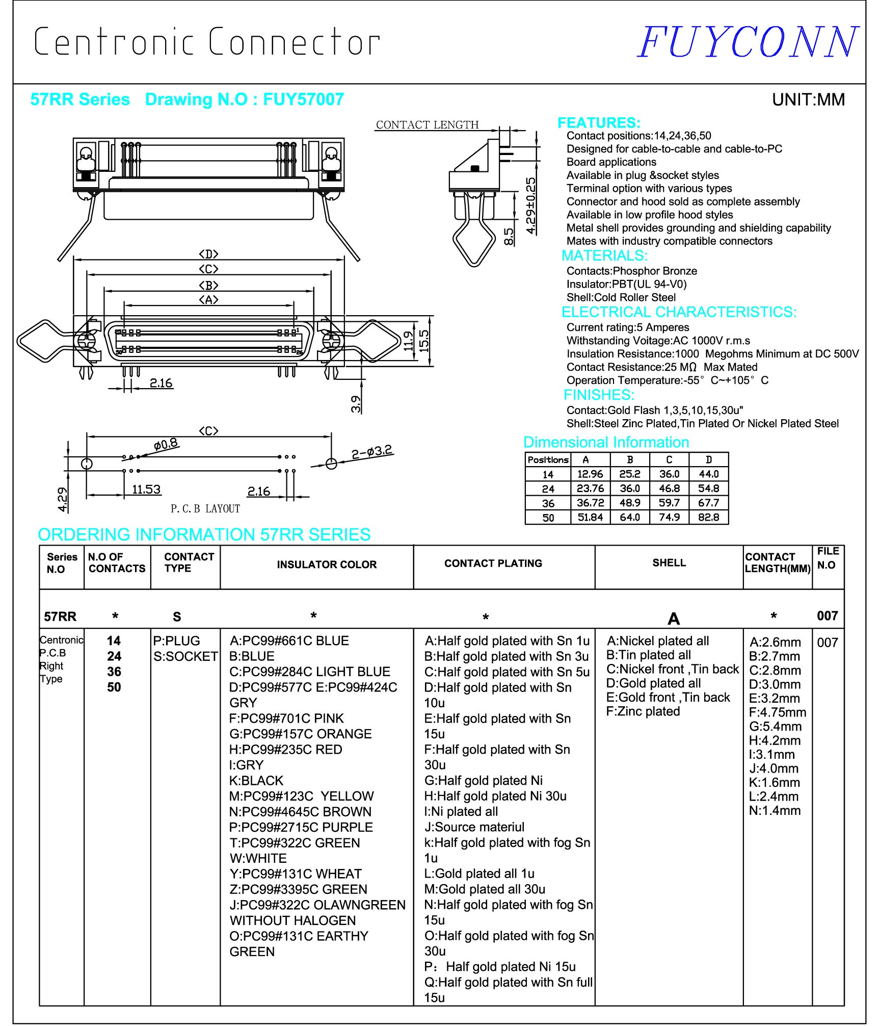 FUY57007 57RR Centronic 50 Way Female PCB Mount Connector R/A Recetpacle with board lock and bail clip